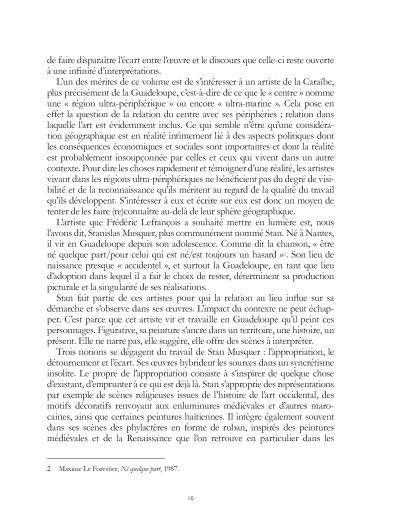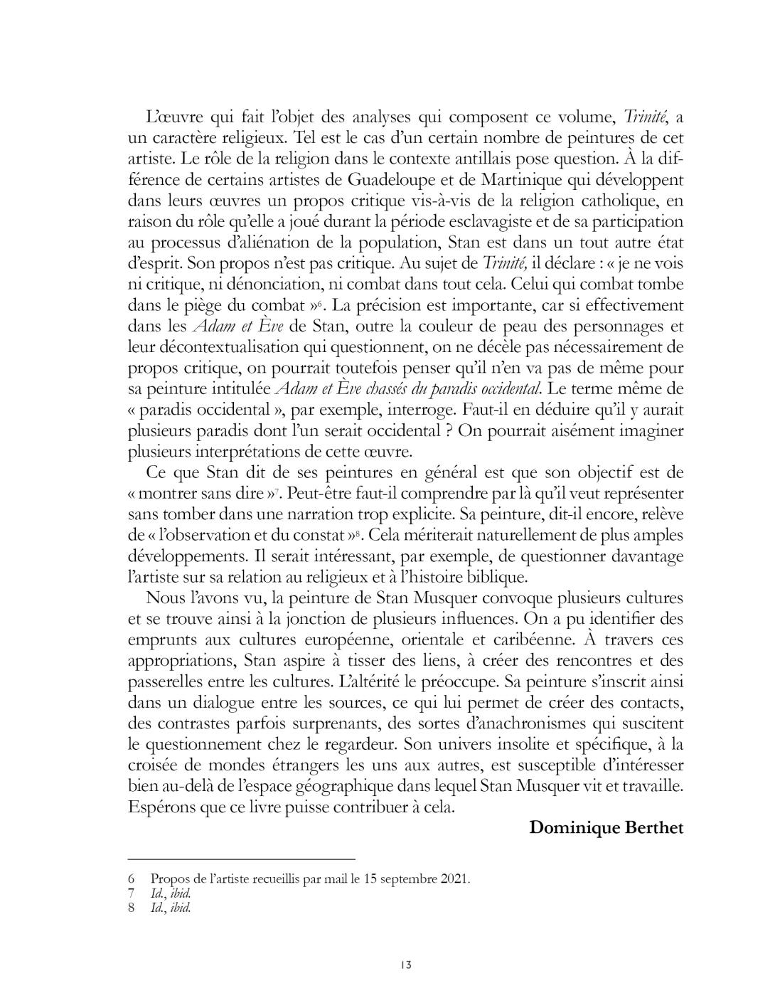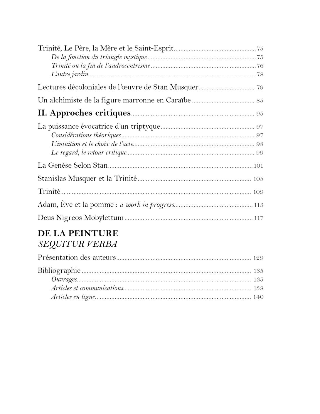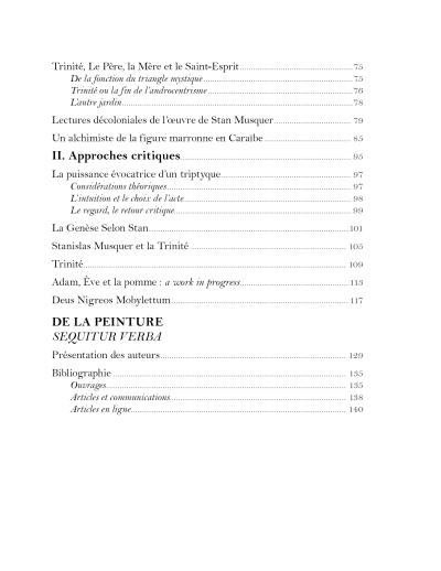 Cet ouvrage collectif est composé d’une douzaine d’études consacrées à Trinité, oeuvre-phare de Stan Musquer, peintre guadeloupéen d’origine nantaise. Cette peinture singulière, au métissage marqué, s’ancre résolument dans la transmodernité caribéenne. Tout en sondant l’âme des sociétés dont elle interroge le passé et les dynamiques actuelles, Trinité se rattache à l’évolution de l’art dans une perspective éminemment transhistorique. Croisant plusieurs angles et modes d’approche différents, une douzaine de chercheurs et critiques d’art se sont penchés sur cette oeuvre énigmatique, et emblématique, de la peinture de Stan, pour en révéler l’originalité et la complexité. À ce carrefour transdisciplinaire sont invitées l’histoire et la sociologie de l’art, la sémiotique et les études décoloniales, autant de perspectives qui féconderont la lecture de cet opus au dialogisme marqué.
