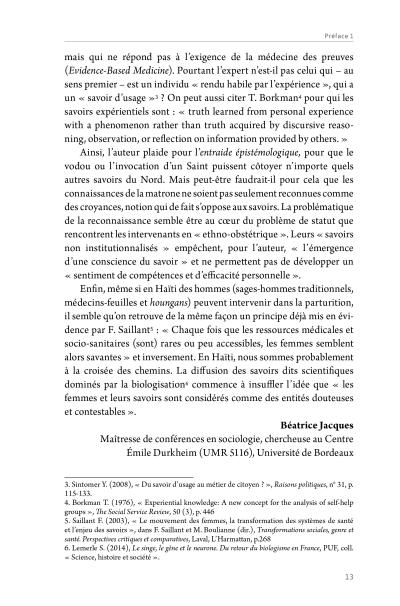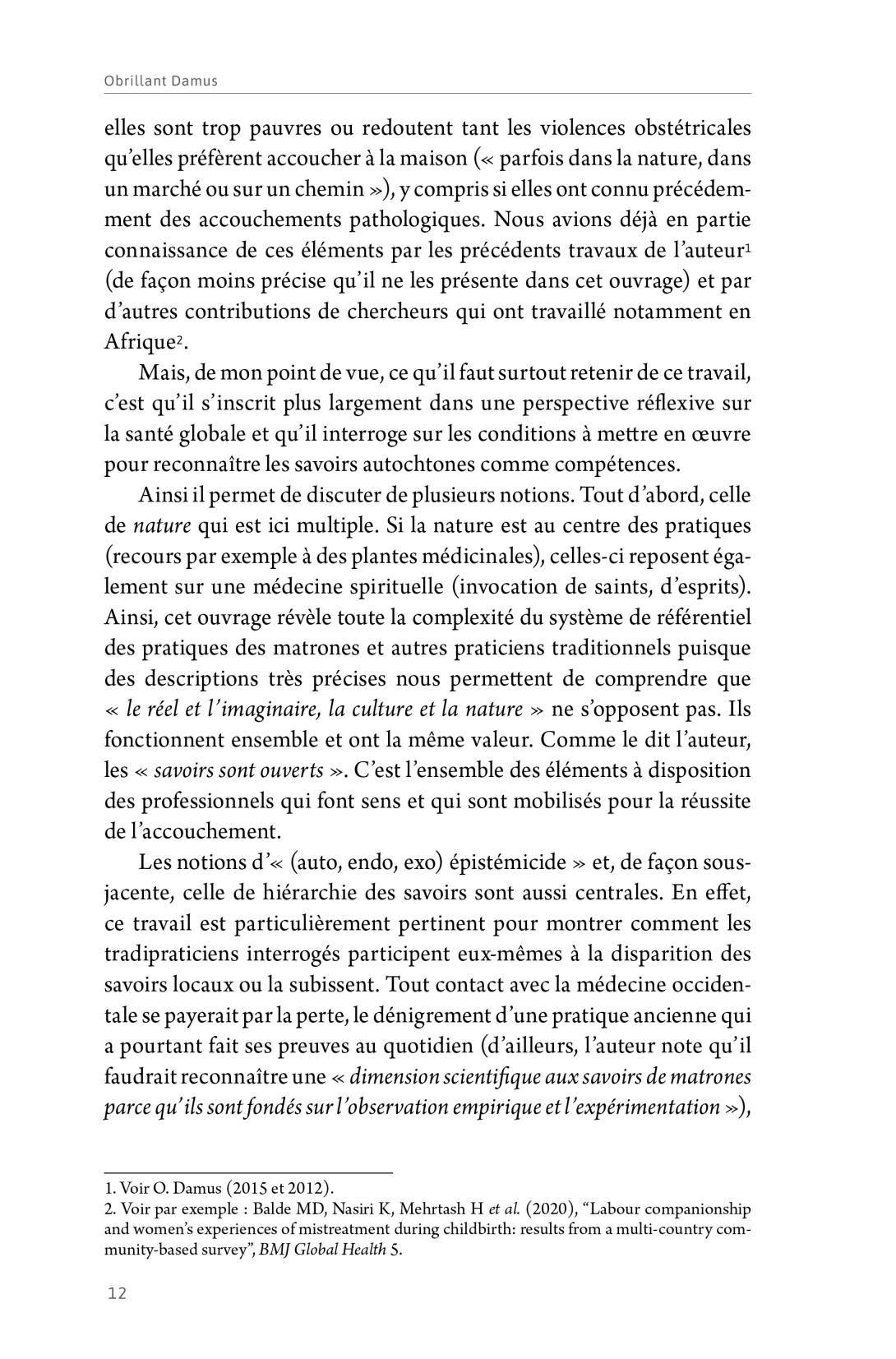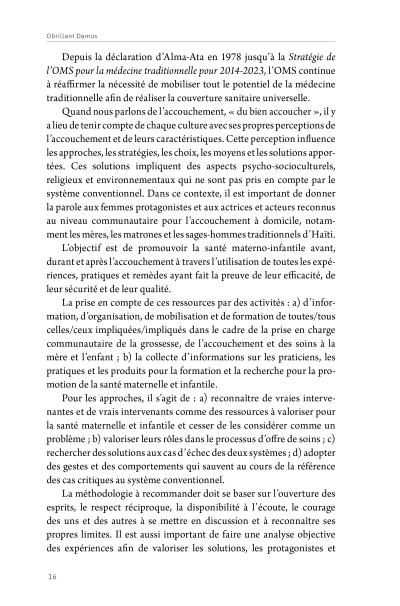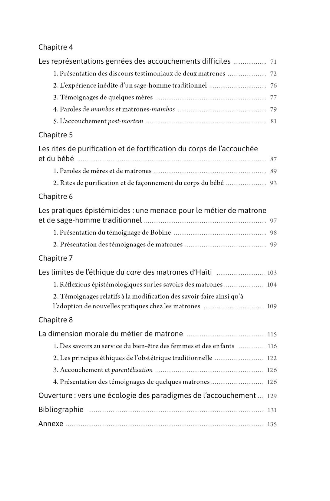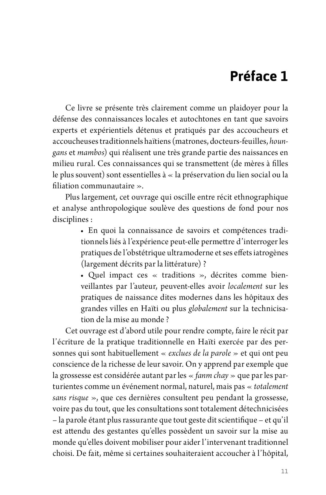 L’accouchement à domicile est un événement biologique et social qui fait appel à la solidarité entre femmes dans les communautés rurales haïtiennes technomédicalement démunies. Les naissances difficiles sont traversées de conceptions nomologico-causales et de conceptions exocausales. Dans le premier cas, elles sont perçues comme des phénomènes procédant de lois naturelles et relevant de ce fait des compétences des matrones (mais rien n’empêche un homme de réaliser un accouchement dont le « blocage » est dû à la lenteur de la nature). Dans le second cas, elles sont considérées comme des phénomènes bloqués par une personne malveillante, un lwa ou un mauvais esprit obligeant les matrones et les proches de la parturiente à céder tout ou partie du terrain de l’accouchement à des hommes appelés houngans exerçant occasionnellement le métier de sajès ou fanm chay gason (sages-hommes traditionnels), à des médecins-feuilles qui s’y connaissent un peu en vodou, ou à des mambos. En Haïti, la transition d’une pratique obstétricale traditionnelle prétendument dangereuse à l’industrialisation toute-puissante du phénomène de la naissance n’est pas souhaitable, d’après les témoignages que nous avons collectés auprès des mères et des matrones.