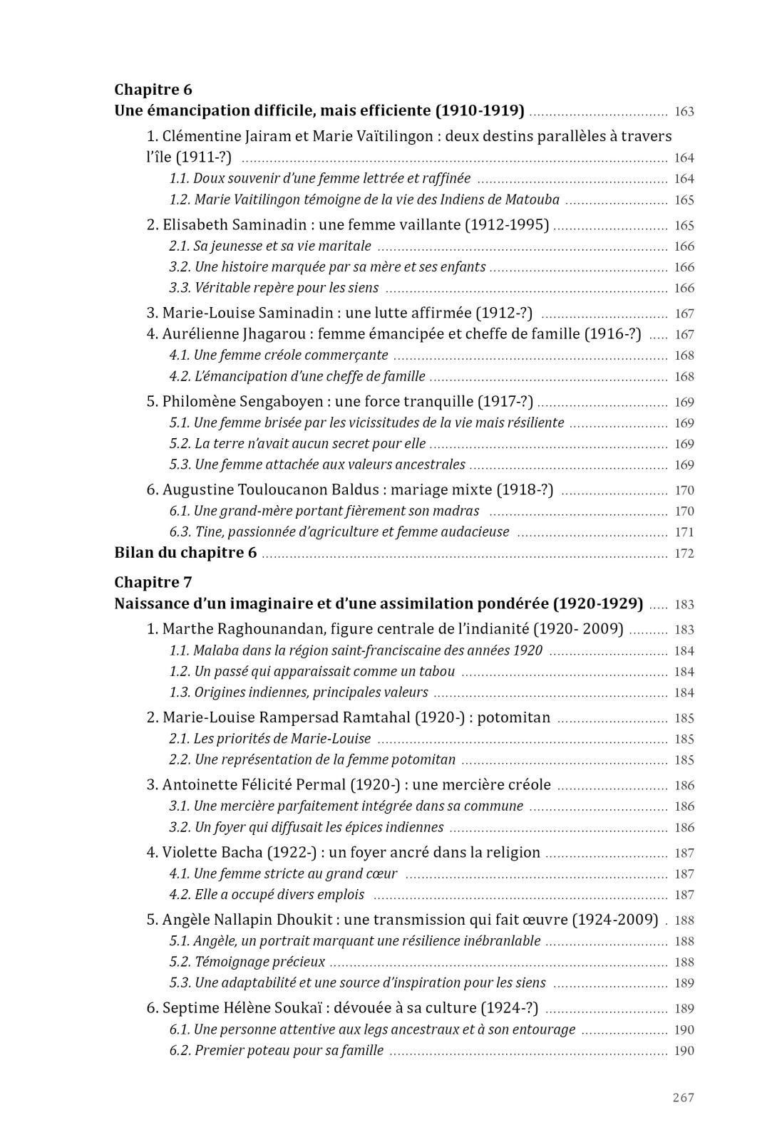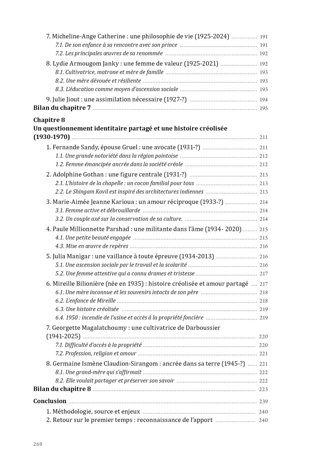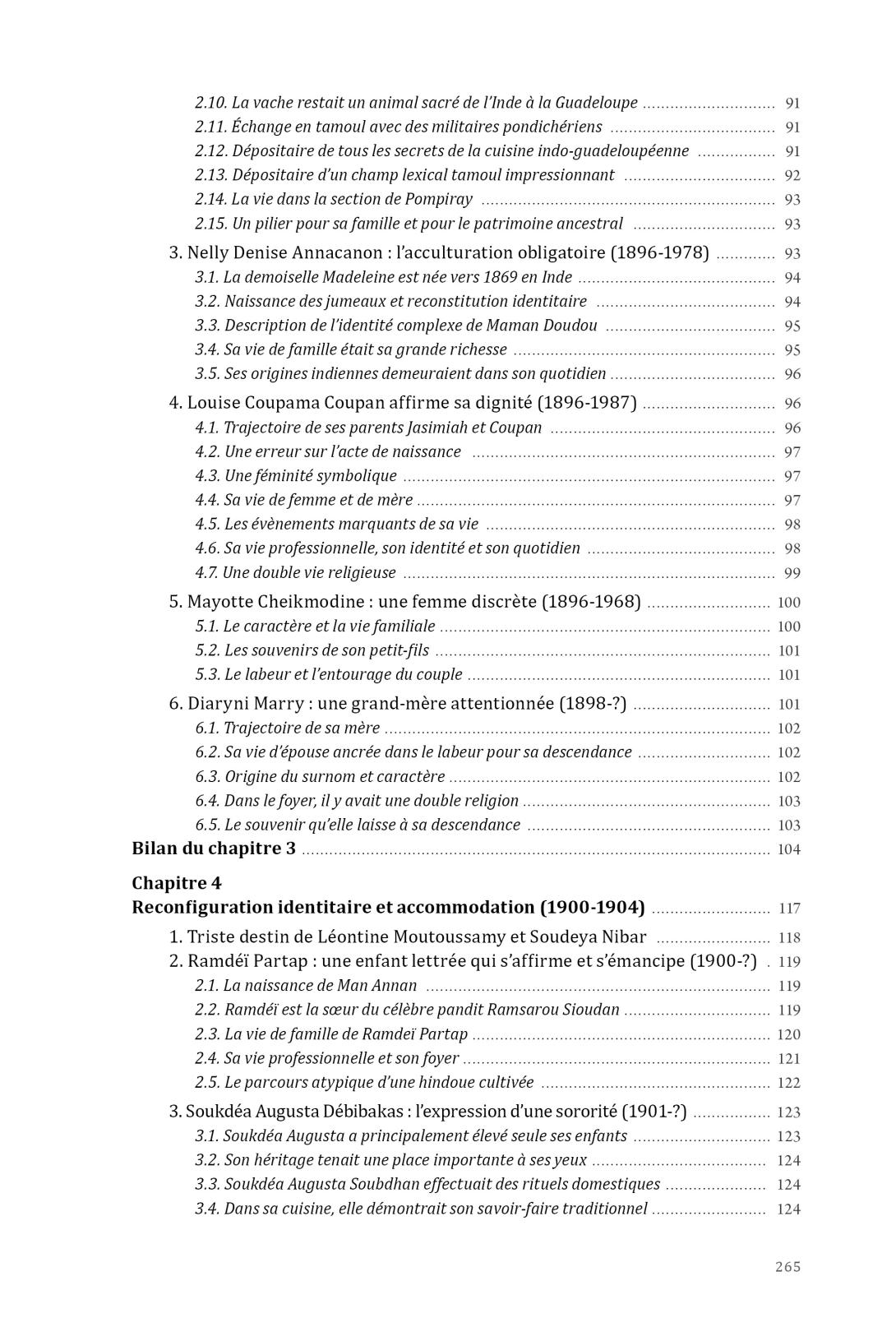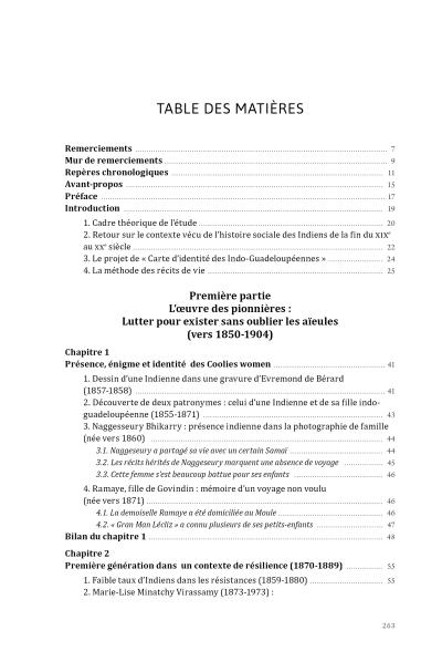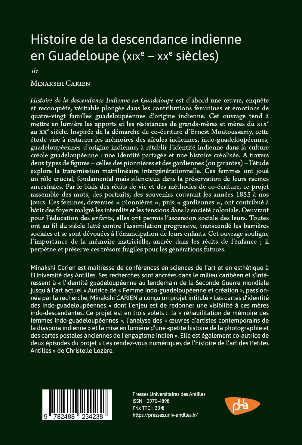Histoire de la descendance indienne en Guadeloupe est d’abord une œuvre, enquête et reconquête, véritable plongée dans les contributions féminines et émotions de quatre-vingt familles guadeloupéennes d’origine indienne. Cet ouvrage tend à mettre en lumière les apports et les résistances de grands-mères et mères du XIXe au XXe siècle. Inspirée de la démarche de co-écriture d’Ernest Moutoussamy, cette étude vise à restaurer les mémoires des aïeules indiennes, indo-guadeloupéennes, guadeloupéennes d’origine indienne, à rétablir l’identité indienne dans la culture créole guadeloupéenne : une identité partagée et une histoire créolisée. A travers deux types de figures – celles des pionnières et des gardiennes (ou garantes) – l’étude explore la transmission matrilinéaire intergénérationnelle. Ces femmes ont joué un rôle crucial, fondamental mais silencieux dans la préservation de leurs racines ancestrales. Par le biais des récits de vie et des méthodes de co-écriture, ce projet rassemble des mots, des portraits, des souvenirs couvrant la période de 1855 à nos jours. Ces femmes, devenues « pionnières », puis « gardiennes », ont contribué à bâtir des foyers malgré les interdits et les tensions dans la société coloniale. Oeuvrant pour l’éducation des enfants, elles ont permis l’ascension sociale des leurs. Toutes ont au fil du siècle lutté contre l’assimilation progressive, transcendé les barrières sociales et se sont dévouée à l’émancipation de leurs enfants. Cet ouvrage souligne l’importance de la mémoire matricielle, ancré dans les récits de l’enfance ; il perpétue et préserve ces trésors fragiles pour les générations futures.