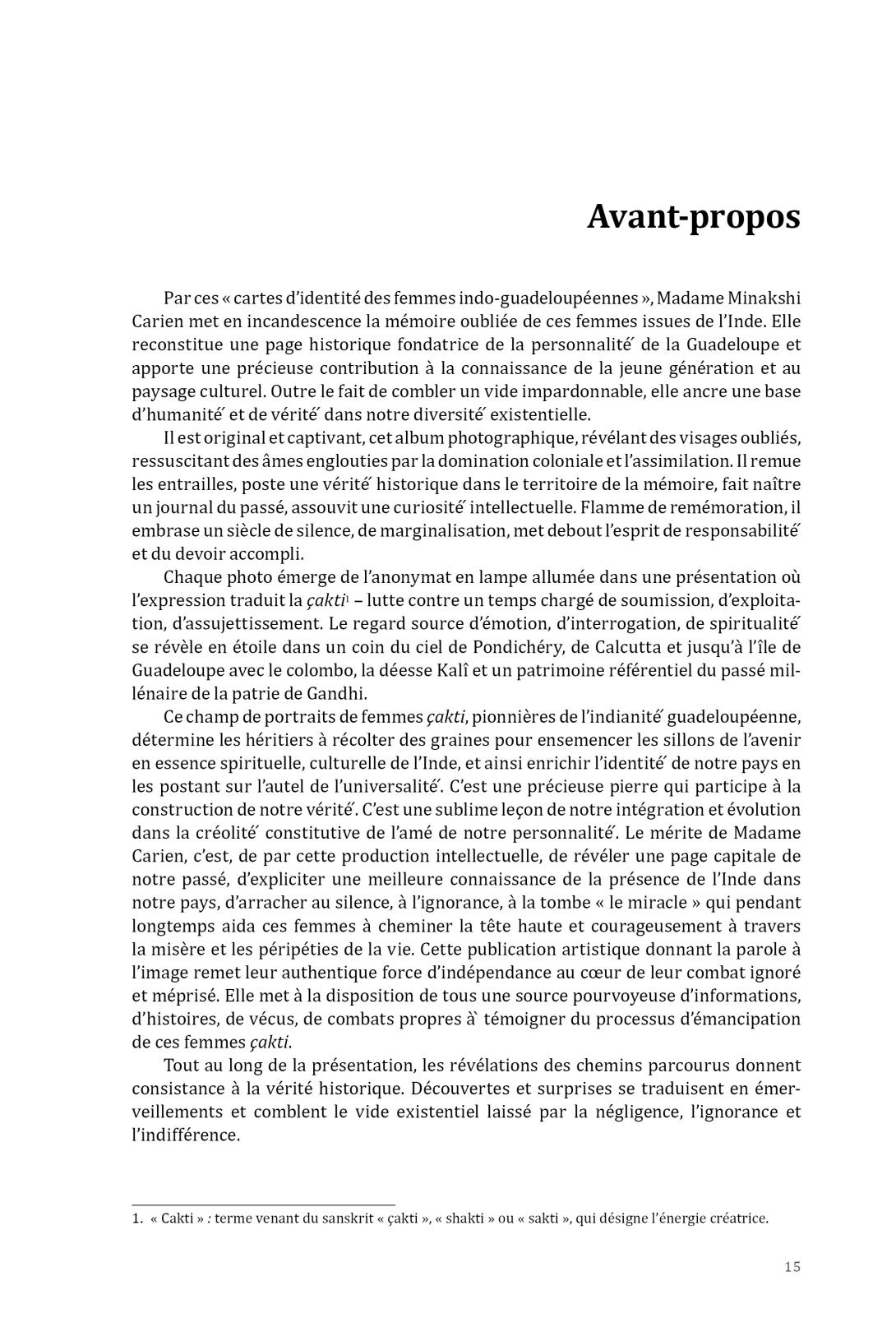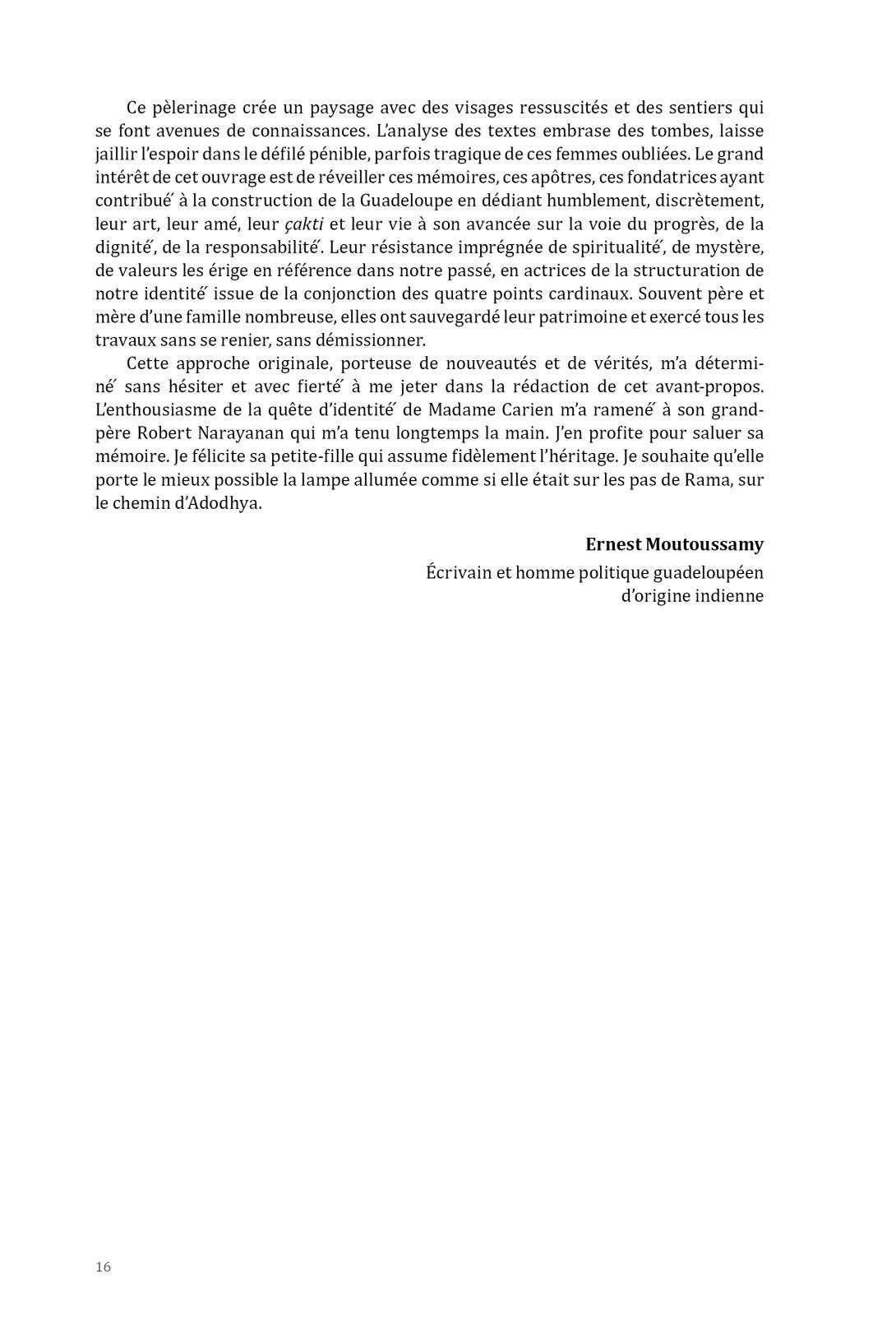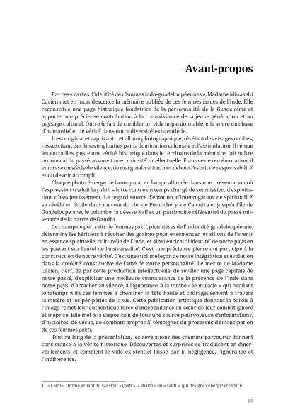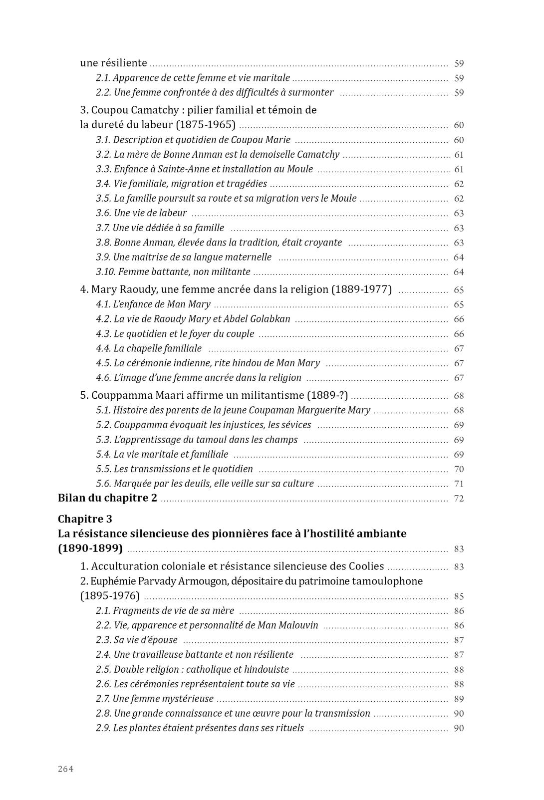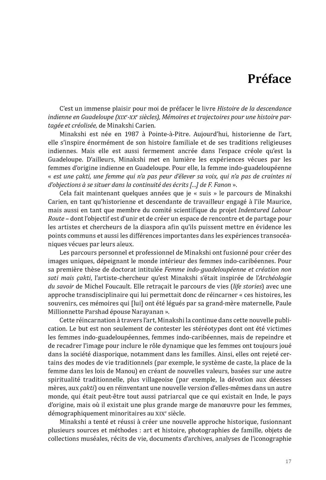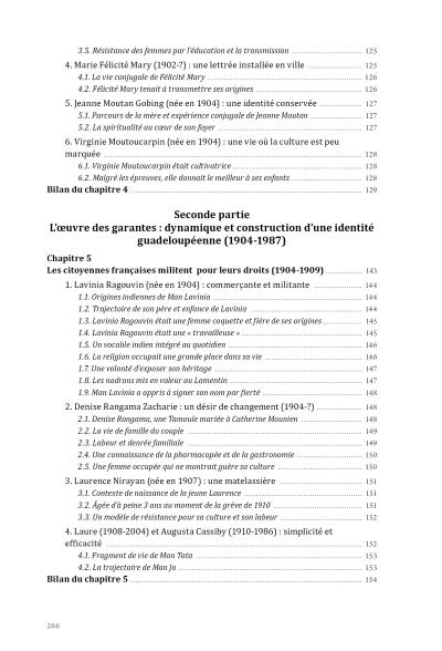 Histoire de la descendance indienne en Guadeloupe est d’abord une œuvre, enquête et reconquête, véritable plongée dans les contributions féminines et émotions de quatre-vingt familles guadeloupéennes d’origine indienne. Cet ouvrage tend à mettre en lumière les apports et les résistances de grands-mères et mères du XIXe au XXe siècle. Inspirée de la démarche de co-écriture d’Ernest Moutoussamy, cette étude vise à restaurer les mémoires des aïeules indiennes, indo-guadeloupéennes, guadeloupéennes d’origine indienne, à rétablir l’identité indienne dans la culture créole guadeloupéenne : une identité partagée et une histoire créolisée. A travers deux types de figures – celles des pionnières et des gardiennes (ou garantes) – l’étude explore la transmission matrilinéaire intergénérationnelle. Ces femmes ont joué un rôle crucial, fondamental mais silencieux dans la préservation de leurs racines ancestrales. Par le biais des récits de vie et des méthodes de co-écriture, ce projet rassemble des mots, des portraits, des souvenirs couvrant la période de 1855 à nos jours. Ces femmes, devenues « pionnières », puis « gardiennes », ont contribué à bâtir des foyers malgré les interdits et les tensions dans la société coloniale. Oeuvrant pour l’éducation des enfants, elles ont permis l’ascension sociale des leurs. Toutes ont au fil du siècle lutté contre l’assimilation progressive, transcendé les barrières sociales et se sont dévouée à l’émancipation de leurs enfants. Cet ouvrage souligne l’importance de la mémoire matricielle, ancré dans les récits de l’enfance ; il perpétue et préserve ces trésors fragiles pour les générations futures.