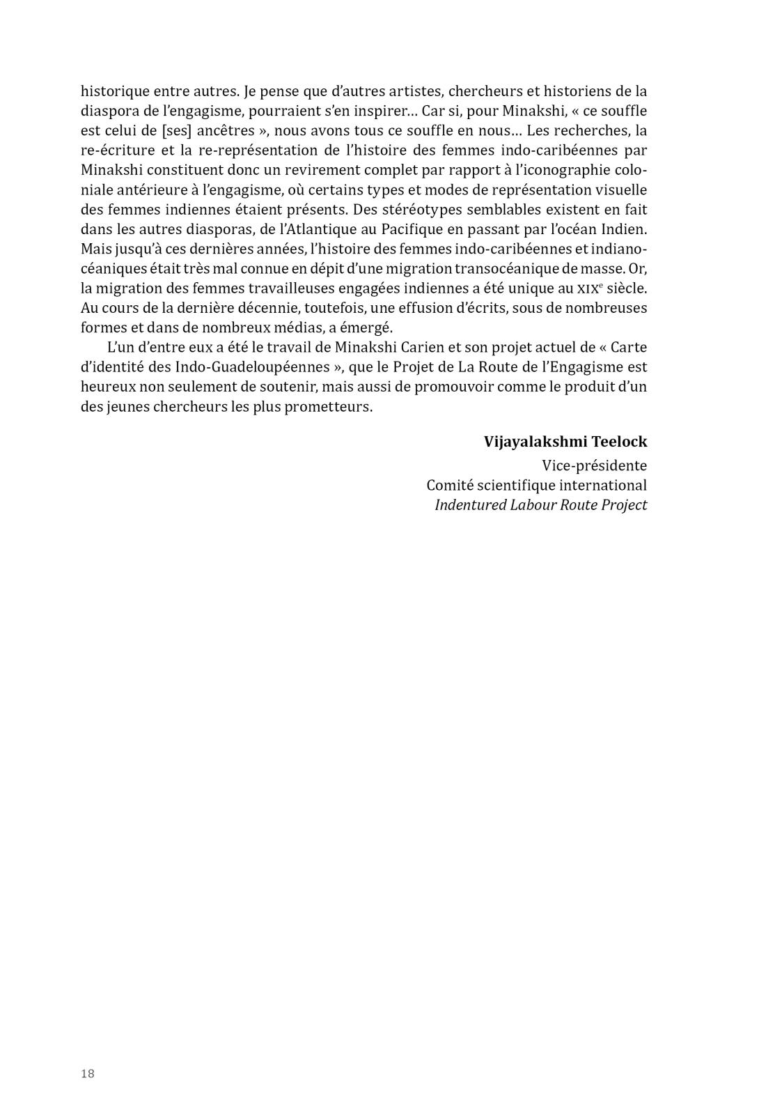 Minakshi CARIEN est maîtresse de conférences en sciences de l’art et en esthétique à l’Université des Antilles. Ses recherches sont ancrées dans le milieu caribéen et s’intéressent à « l’identité guadeloupéenne au lendemain de la Seconde Guerre mondiale jusqu’à l’art actuel ». Autrice de Femme indo-guadeloupéenne et création, passionnée par la recherche, Minakshi Carien a conçu un projet intitulé « Les cartes d’identité des Indo-guadeloupéennes » dont l’enjeu est de redonner une visibilité à ces mères indo-descendantes. Ce projet est en trois volets : la « réhabilitation de mémoire des femmes indo-guadeloupéennes », l’analyse des « œuvres d’artistes contemporains de la diaspora indienne » et la mise en lumière d’une « petite histoire de la photographie et des cartes postales anciennes de l’engagisme indien ». Elle est également co-autrice de deux épisodes du projet « Les rendez-vous numériques de l’histoire de l’art des Petites Antilles » de Christelle Lozère.